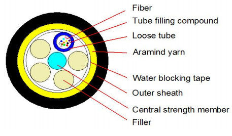 ADSS ক্যাবলটি একটি লস টিউব স্ট্র্যান্ডেড। ফাইবার, 250μm, উচ্চ মডিউল প্লাস্টিকের তৈরি একটি লস টিউব মধ্যে অবস্থিত। টিউবগুলি একটি